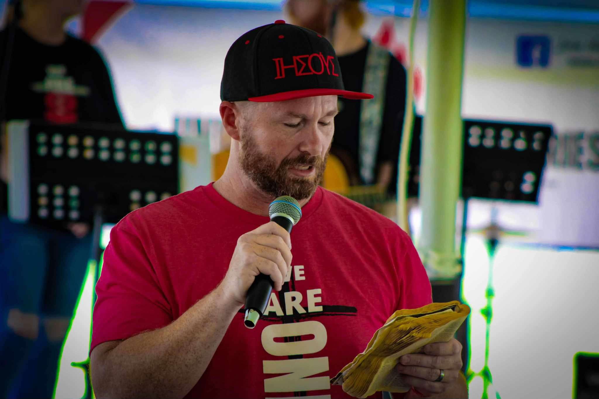 When we arrived at the Catholic church, I was fascinated by the illuminated Greyhound bus parked in front that displayed "Heaven" as the destination. We walked into the church, and it turned out to be a Catholic charismatic prayer meeting with people from all different denominations praising the Lord and hands lifted high. We used to sing to drunks, and for us to see this group with their hands raised singing songs to Jesus was amazing, we both realized that maybe it was Jesus that we were missing in our lives.